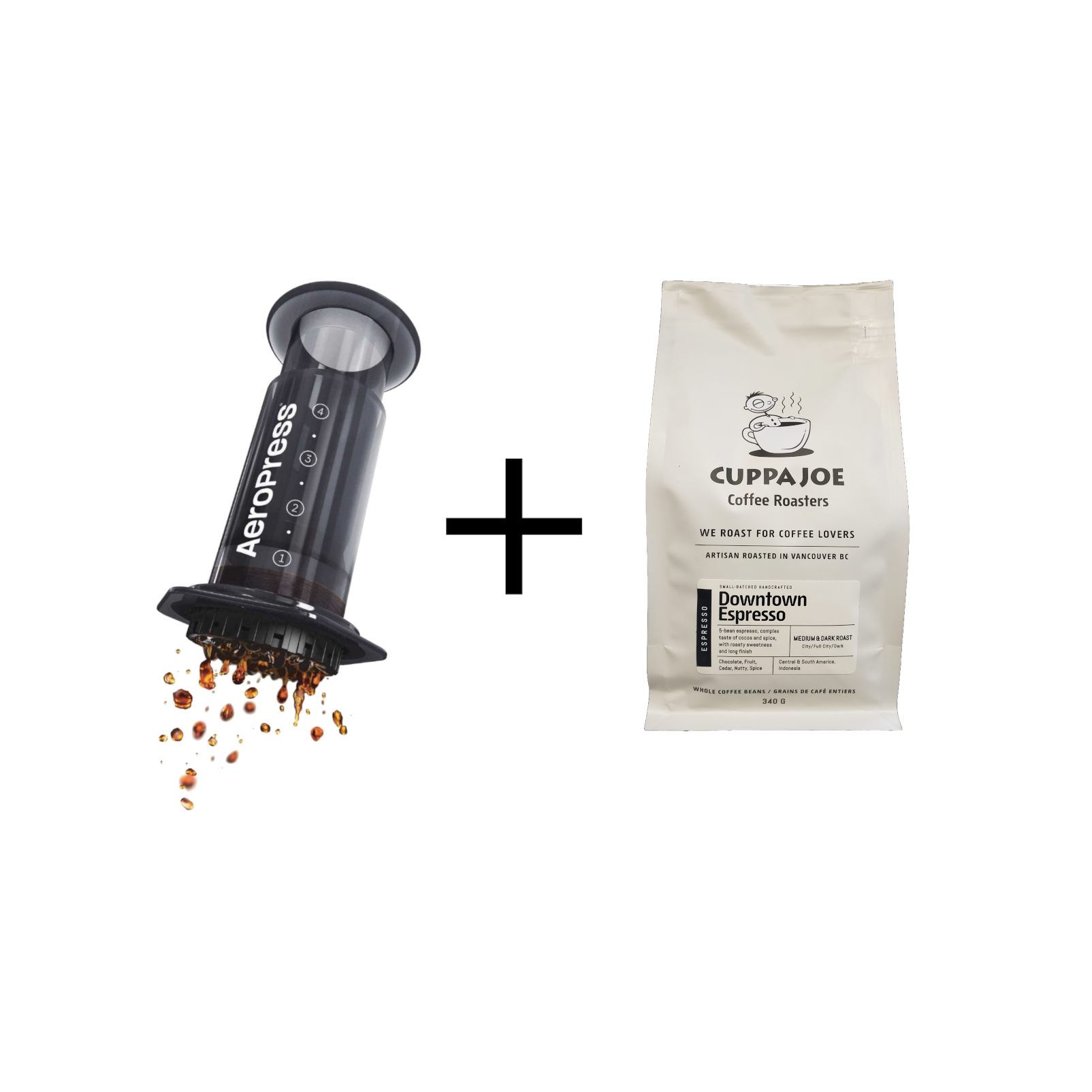 This bundle includes everything you need to start enjoying your AeroPress right out of the box. Test your barista skills and create an exceptional cup of CuppaJoe Downtown Espresso.