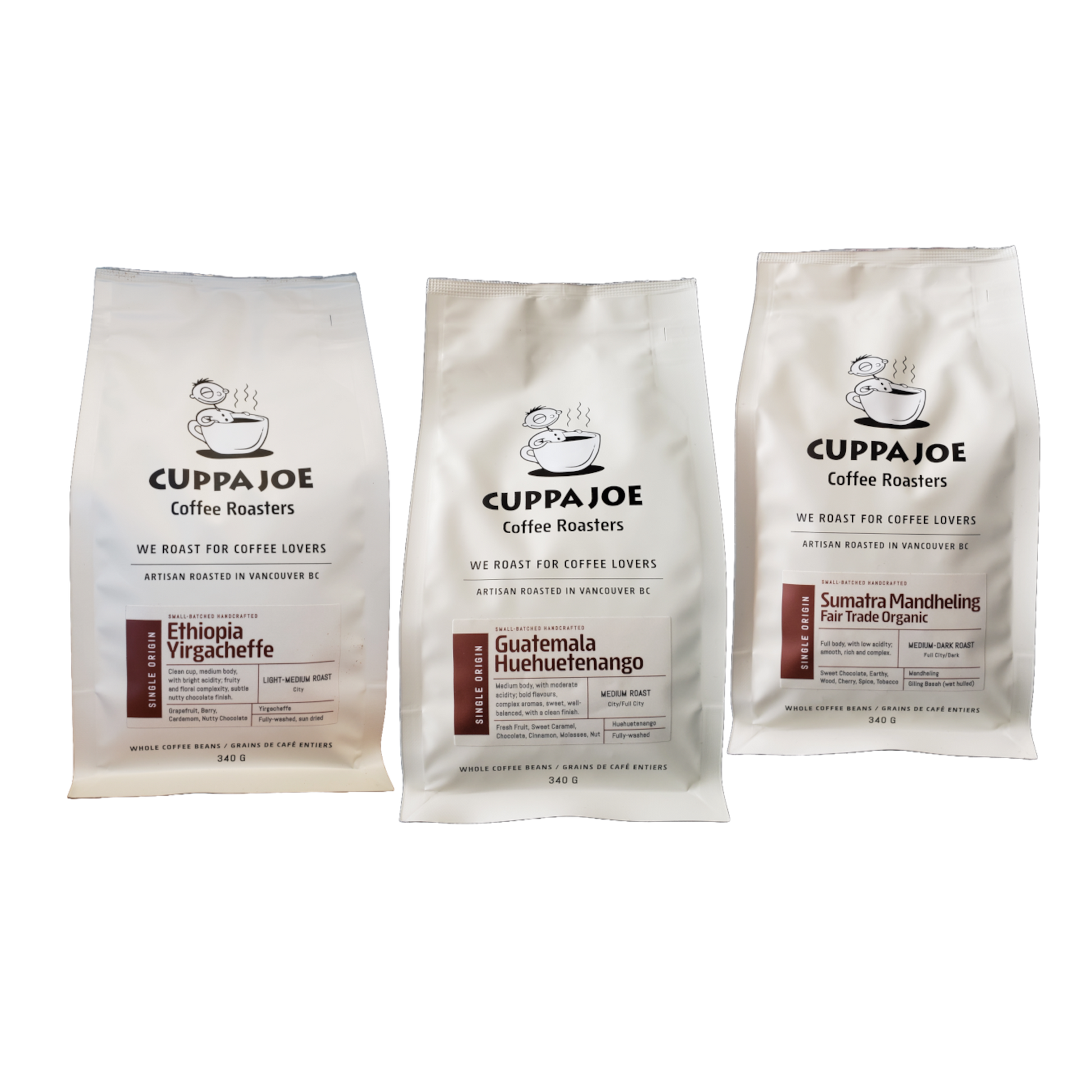 - 1 x Ethiopia Yirgacheffe - Light-Medium Roast: Clean cup, with medium body, bright acidity, fruity and floral complexity.